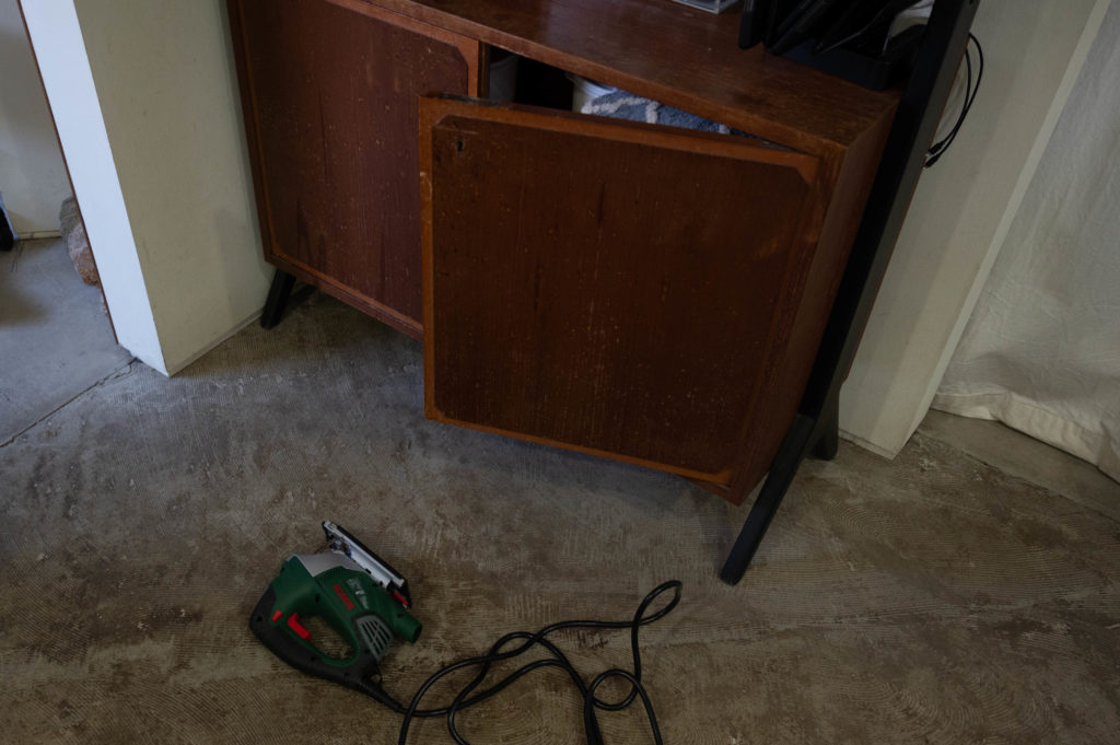 この中にはシャンプーなどの詰め替えが入っているので早急に空けないとお客様の頭があらえなくなるのでジグソーでカット。